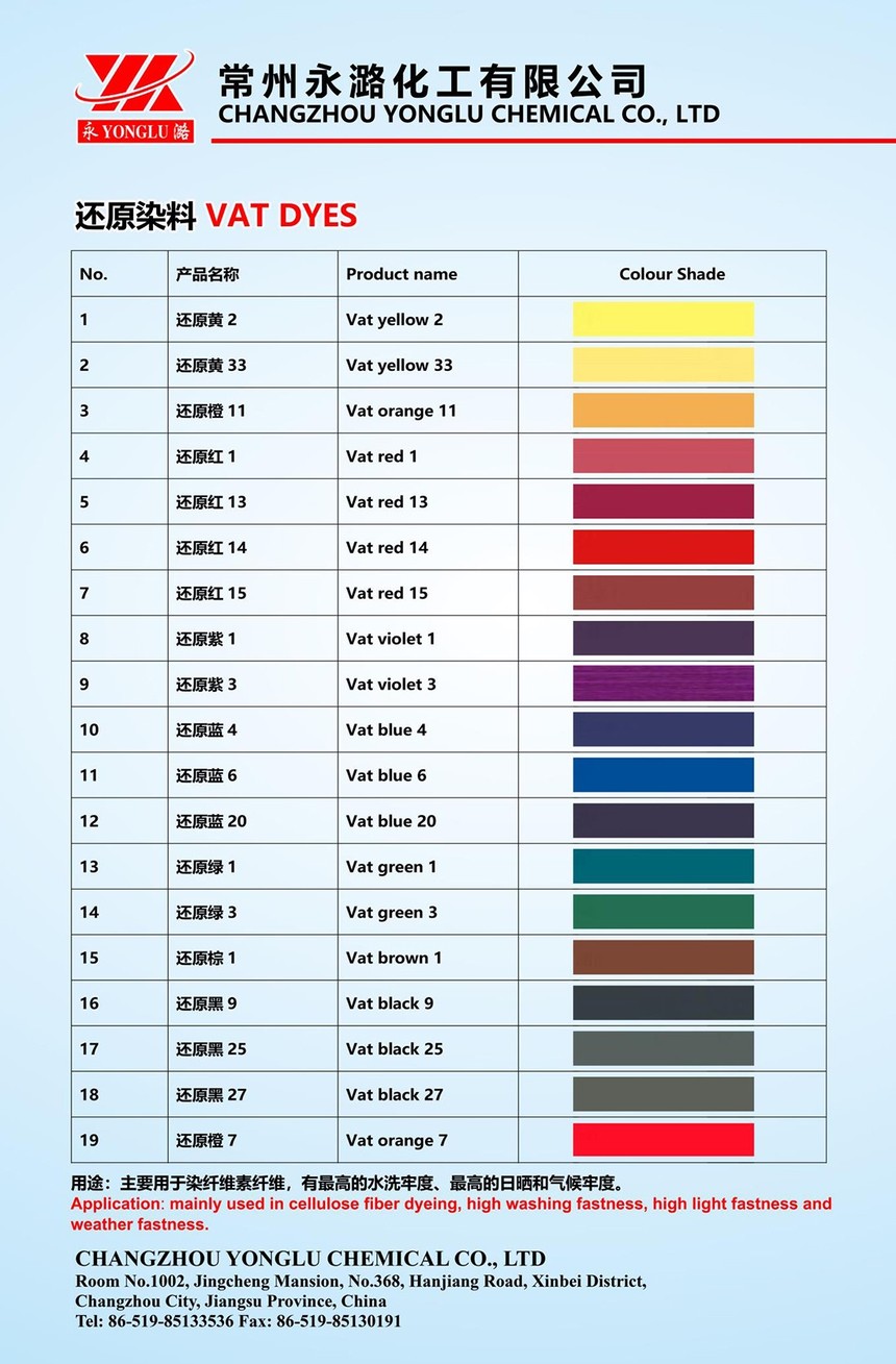 Vat dyes main used in cellulose fiber dyeing, high washing fastness, high light fastness and weather fastness.